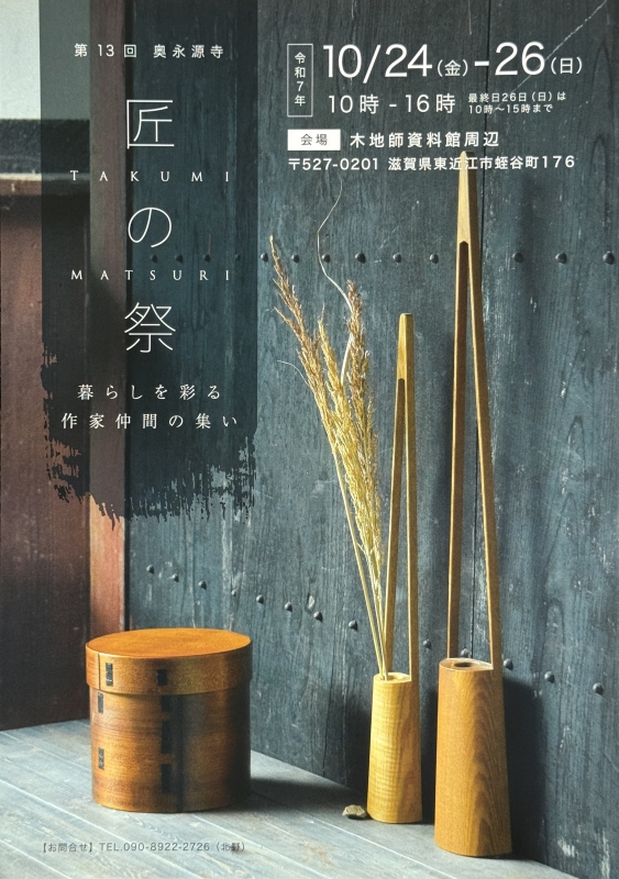 -                           2025.10.24(Fri) NEW 第13回奥永源寺「匠の祭」出展 第13回奥永源寺「匠の祭」出展日時)2025年10月24日(金)〜10月26日(日)10時〜16時 ...read more